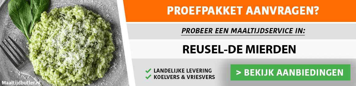 In dit gebied leveren o.a. Maaltijdservice.nl, Mealhero, Kantenklaarmaaltijden.nl, Uitgekookt, Apetito, Diepvriesman. De thuismaaltijden van deze aanbieders moet u nog wel even opwarmen. De verse maaltijden aan huis in Reusel-De Mierden worden vaak thuisbezorgd door zorginstellingen en organisaties voor maatschappelijk werk in Reusel-De Mierden.