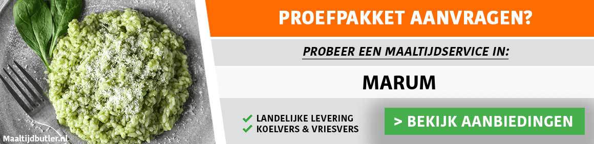 In de regio bezorgen bedrijven als Mealhero, Maaltijdservice.nl, Apetito, Uitgekookt, Kantenklaarmaaltijden.nl, Vers Aan Tafel. Deze gezonde thuismaaltijden moeten nog wel opgewarmd worden. De verse maaltijden aan huis in Marum worden vaak thuisbezorgd door vrijwilligersorganisaties en organisaties voor maatschappelijk werk in Marum.